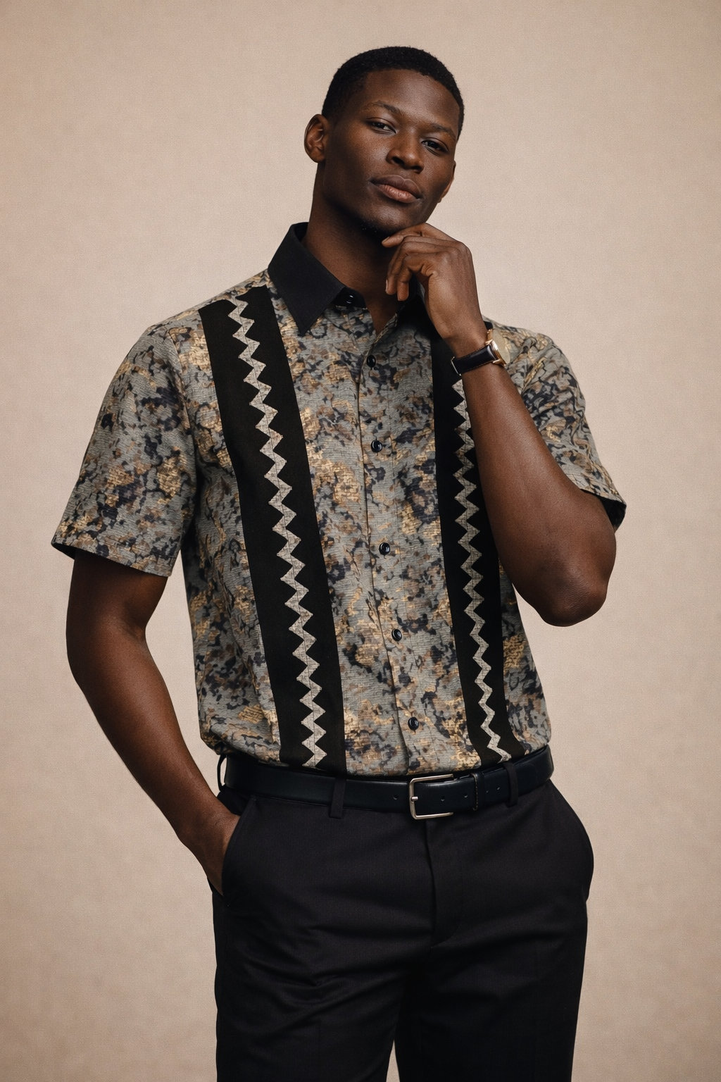It features a textured patterned fabric in earthy neutral tones, accented with subtle gold details that add depth and quiet luxury. The front is highlighted by bold vertical panels with zig-zag motifs, drawing inspiration from traditional African symbols while maintaining a clean, minimalist structure. A sharp collar and tailored silhouette give the shirt a polished, contemporary finish.